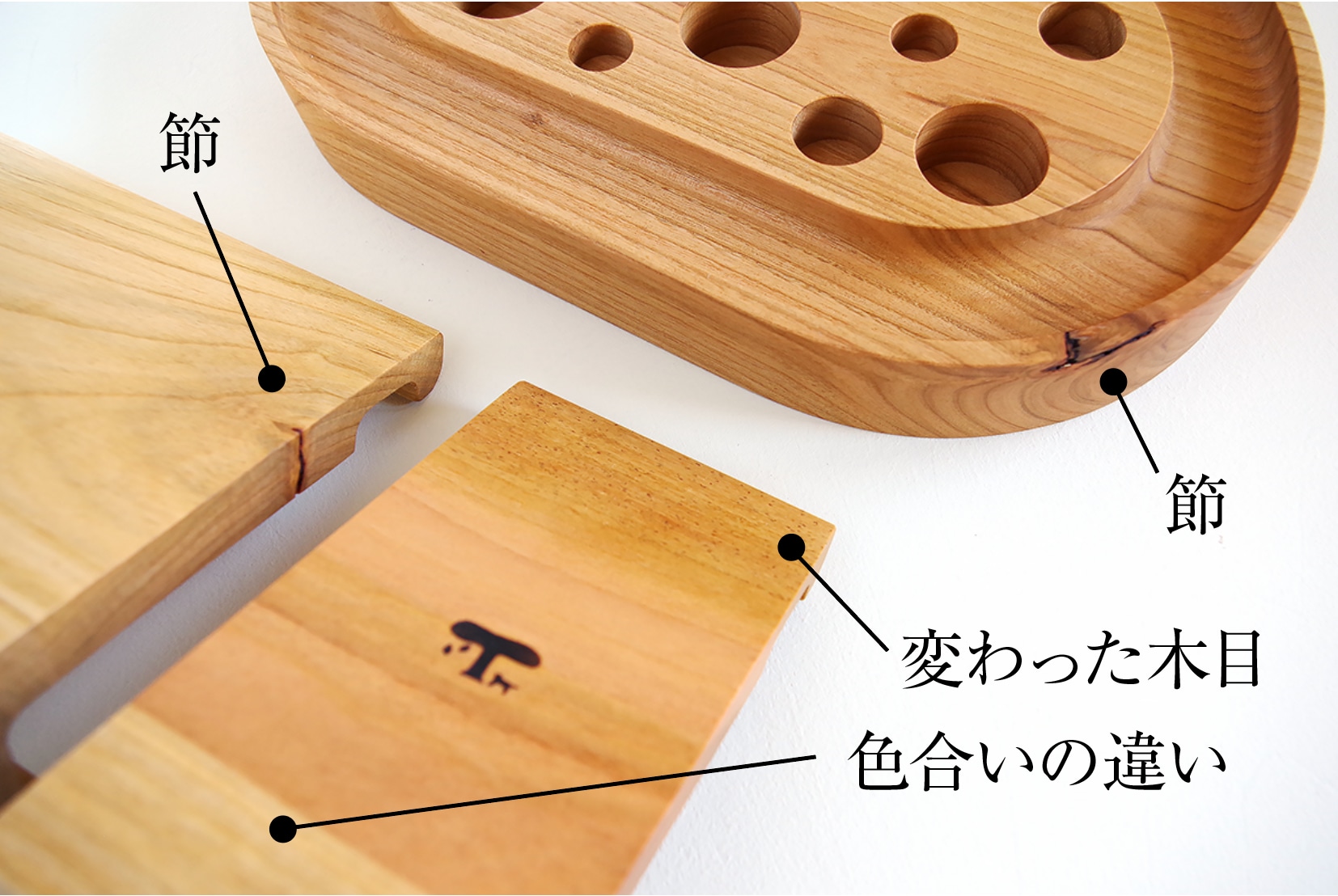 特に比較的木材の面積の多いもの、SPACE、スマートフォン・タブレットスタンドを中心に上記のような木目が入ることが増えてくると思います。特徴のある木目を避けることで無駄になる材料が増えてしまうことを避けるため、どうぞご理解・ご了承いただけましたら幸いです。